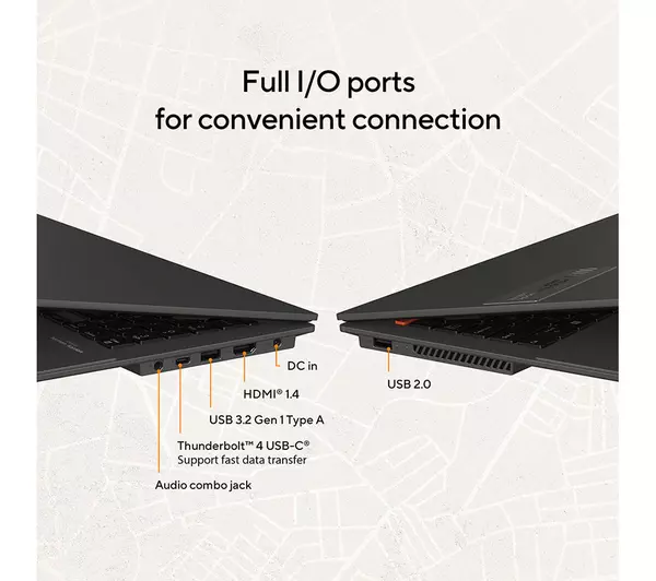 Ports: USB 3.2 x1, USB 2.0 x1, Thunderbolt 4 x1, HDMI 1.4 x1, 3.5 mm jack.