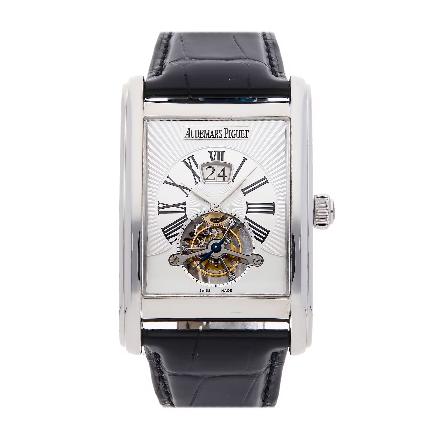 Gorgeous silver dial featuring Roman numeral hour markers