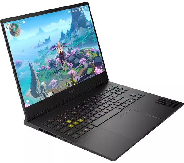 HP OMEN Transcend 16 Laptop, AC adapter, and power cord.