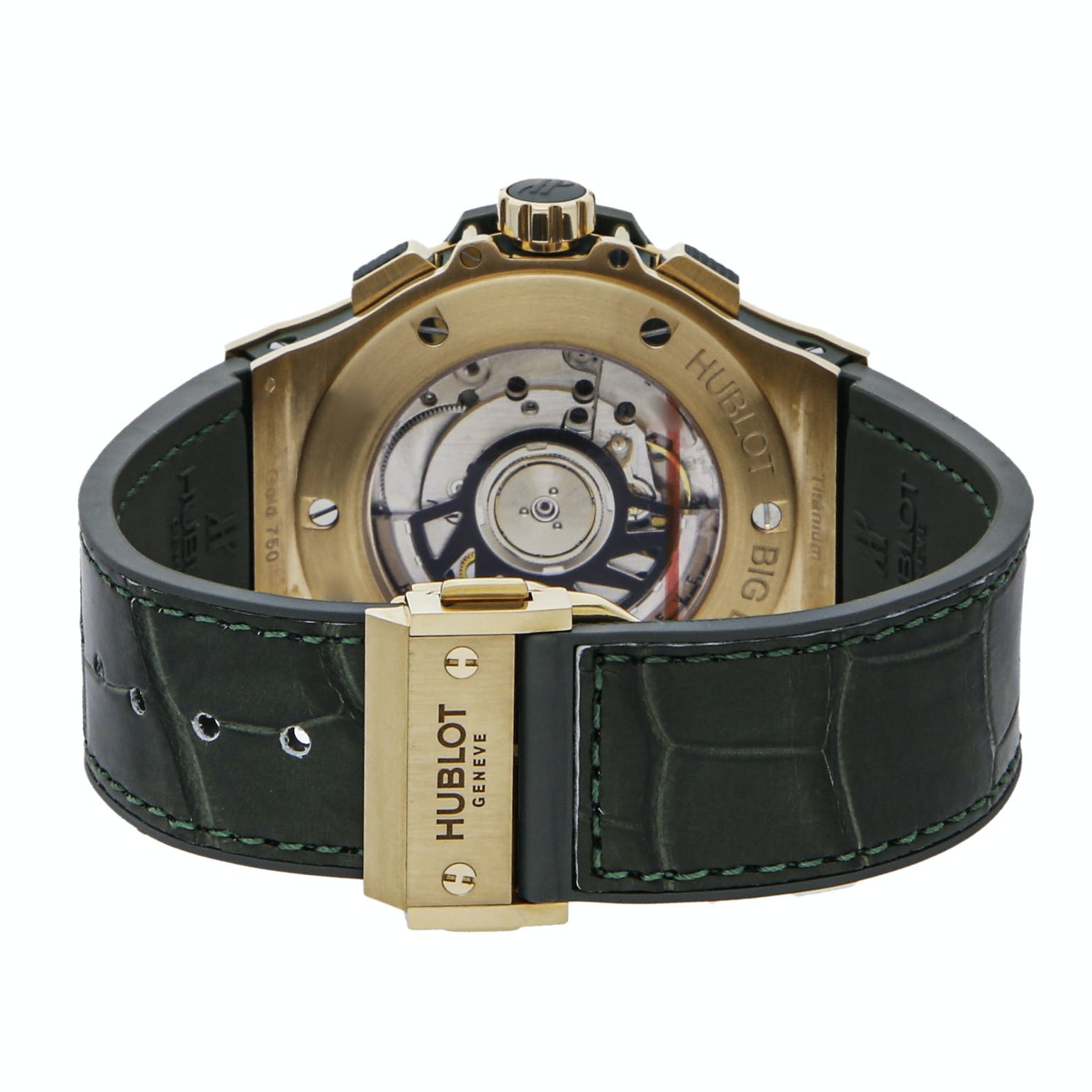 Coordinating green alligator strap imparts an opulent feel