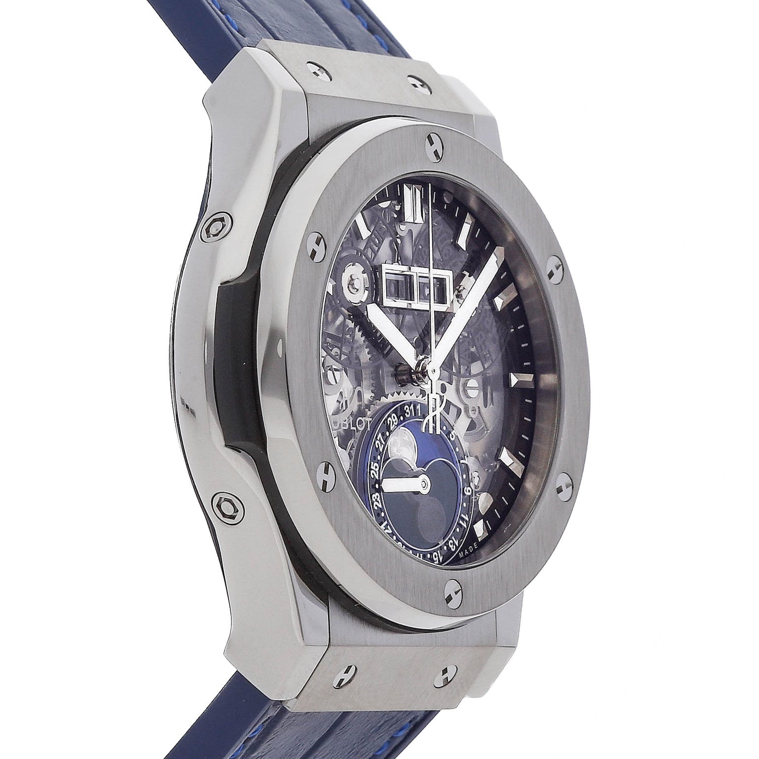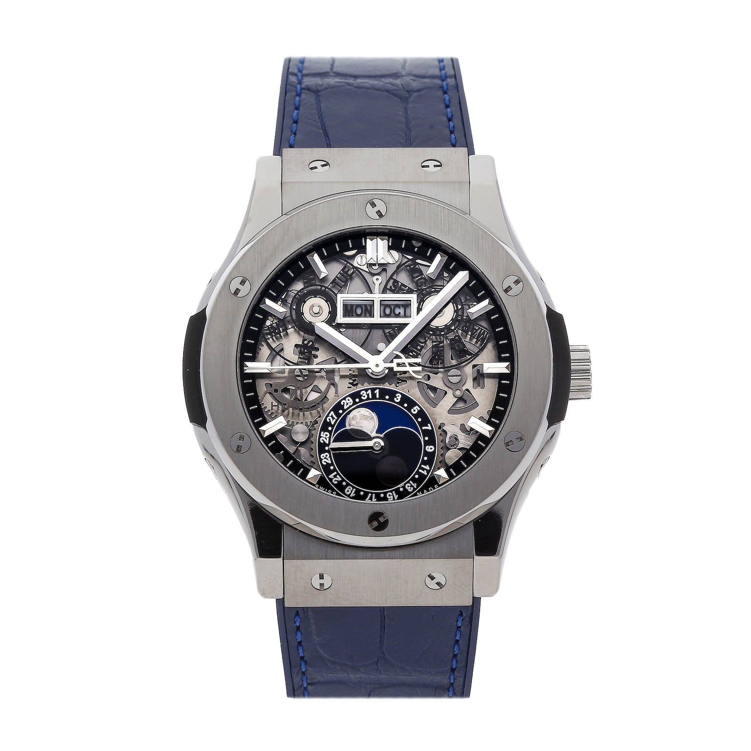 Features complications including date, day, month, and moon phase