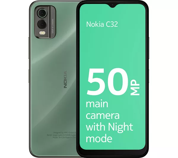 Box Contents: Nokia C32, USB-C cable, eject pin, quick start guide.